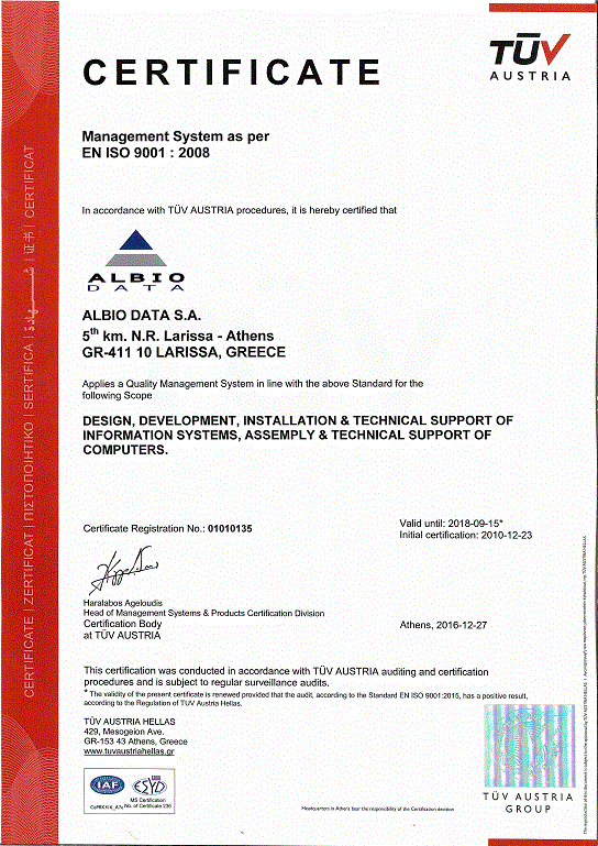 ALBIODATA, INFORMATION SYSTEMS - BUSINESS CONSULTANTS is qualified by the international organisation LRQA.(Lloyd`s Register Quality Assurance) by the ISO 9001:2000 standard for the design-development-installation and technical support of Information Systems. This proves the importance the company gives in the field of high quality and stability of its services. The company also tries its best to keep its personnel trained, maintaining a technical advantage for the direct and responsible coverage of its clients needs.